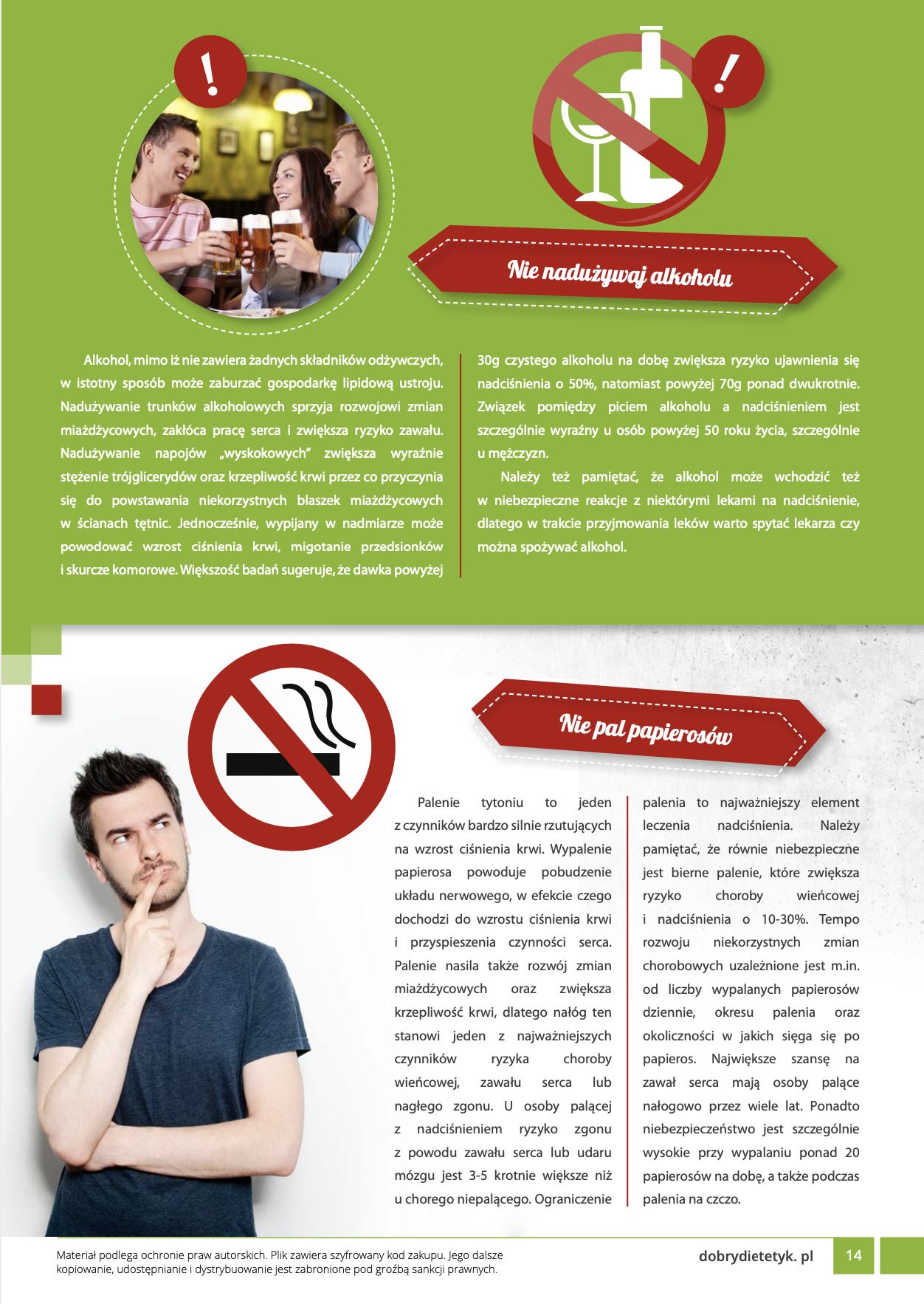 Kompleksowy program żywieniowy dla MĘŻCZYZNzmagających się z problemem nadciśnienia tętniczego. Opracowanie zawiera specjalnie przygotowany przewodnik edukacyjny oraz 30-dniowy jadłospiswspomagający redukcję podwyższonego ciśnienia krwi. W diecie zwrócono szczególną uwagę na podaż składników odżywczych wpływających na relaksację i zdrowie naczyń krwionośnych. Obok uwzględnienia ogólnych potrzeb żywieniowych mężczyzn, zadbano m.in. o podaż odpowiedniej ilości sodu potasu, zachowanie odpowiednich proporcji między tymi składnikami a także dostarczenie zwiększonej ilości kwasów omega-3, które wpływają na procesy rozkurczowe naczyń krwionośnych. W przygotowanej diecie zwrócono także uwagę na ograniczenie podaży składników o działaniu miażdżycorodnym a także zwiększono podaż witamin chroniących naczynia krwionośne przed uszkodzeniem. Dieta sprawdzi się także idealnie w programach redukcji wagi u mężczyzn, w chorobach układu krążenia a także jako dieta po zawale.