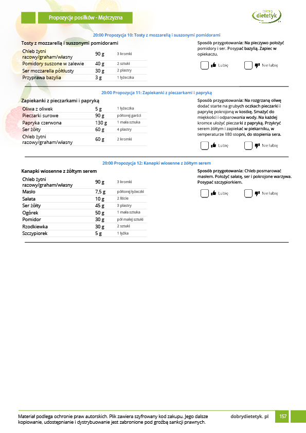 w formie propozycji posiłków (zamiast pojedynczych jadłospisów jednodniowych, przygotowano propozycje kilku propozycji dań na każdy posiłek). Tutaj nie uzależniamy Cię od tego jakie masz np. w danym dniu zjeść śniadanie czy obiad, tylko sam wybierasz sobie ulubione danie z kilku przedstawionych przez nas propozycji.