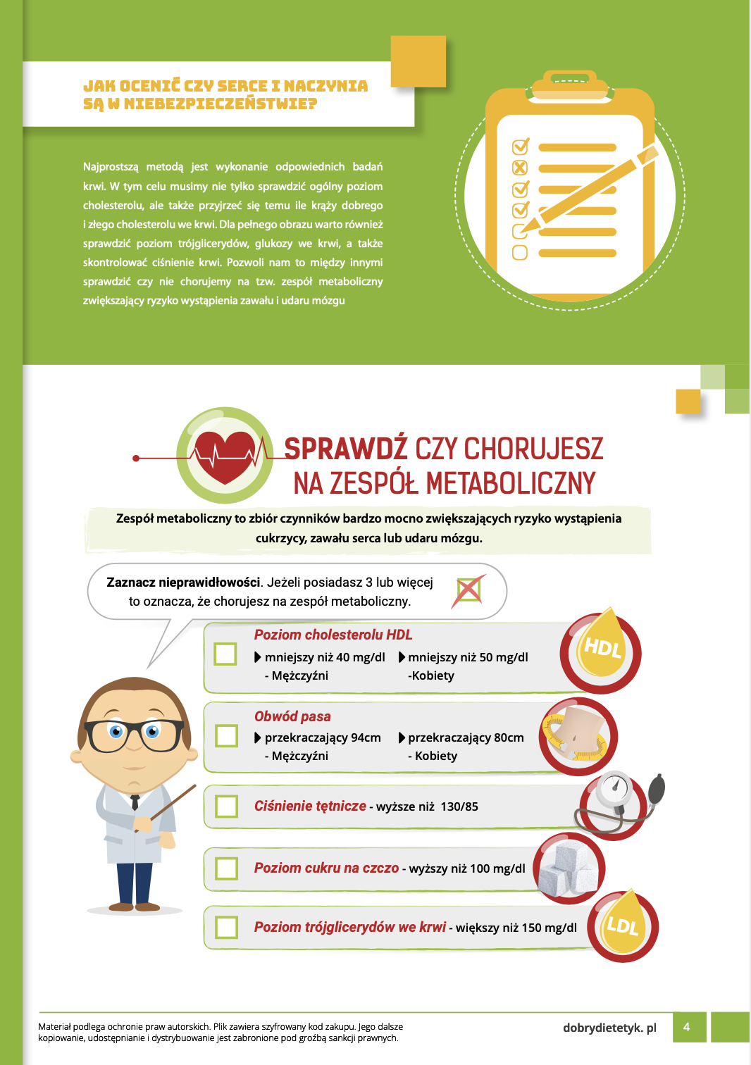 Kompleksowy program żywieniowy dla mężczyzn, który w naturalny sposób pomaga obniżać poziom cholesterolu we krwi. Specjalnie opracowana 30-dniowa dieta obok korzystnego wpływu na cholesterol, funkcjonowanie serca i układu krążenia działa także korzystnie na redukcję zbędnej masy ciała. W jej składzie zadbano w szczególności o składniki normalizujące gospodarkę tłuszczową organizmu a także witaminy antyoksydacyjne chroniące przed rozwojem zmian miażdżycowych. Dieta sprawdza się dodatkowo u mężczyzn u których stwierdzono także inne nieprawidłowości w obrazie krwi, jak podwyższony cukier, trójglicerydy czy badania wątrobowe.