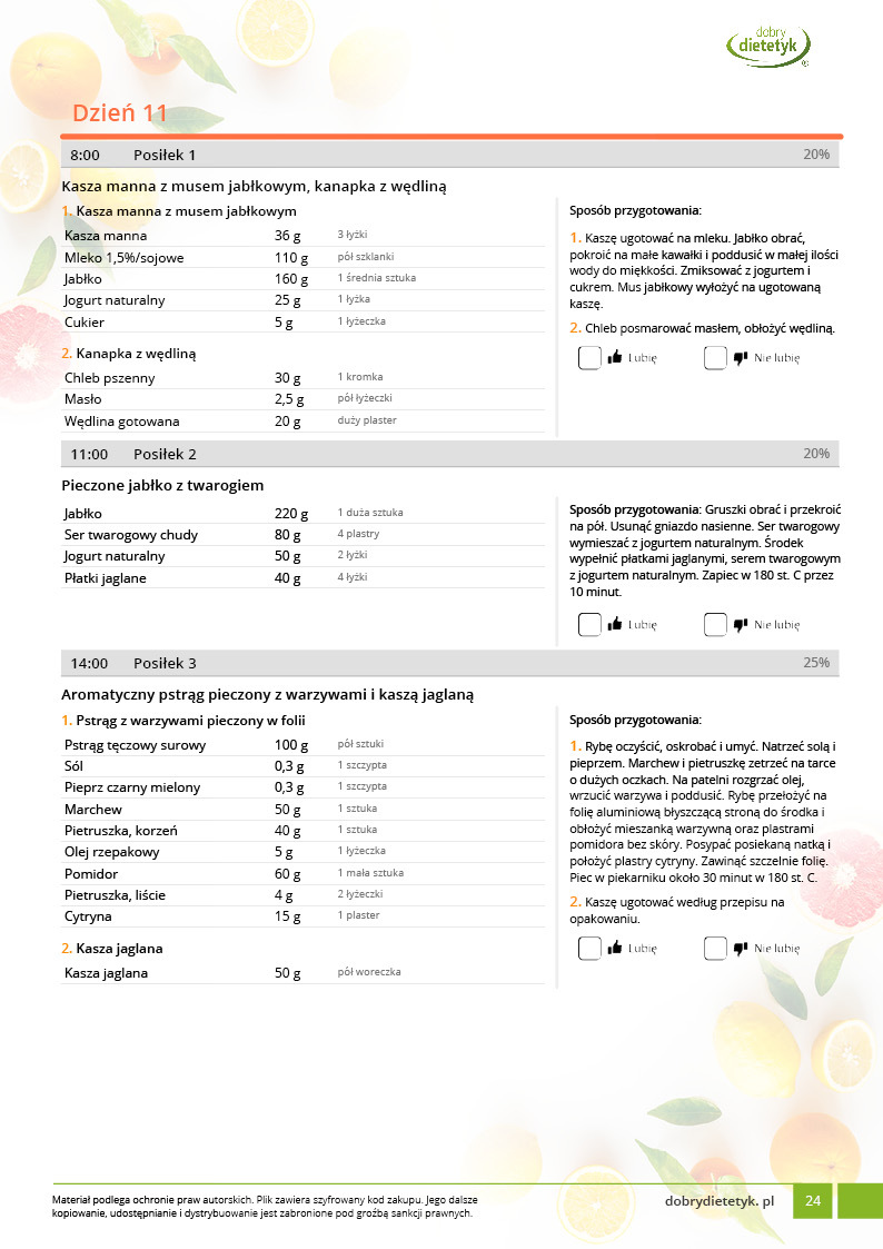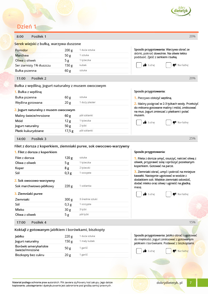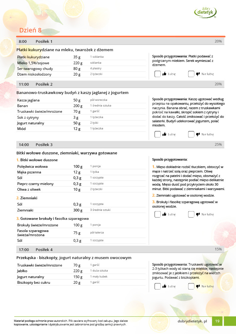 w formie propozycji posiłków (zamiast pojedynczych jadłospisów jednodniowych, przygotowano propozycje kilku propozycji dań na każdy posiłek). Tutaj nie uzależniamy Cię od tego jakie masz np. w danym dniu zjeść śniadanie czy obiad, tylko sam wybierasz sobie ulubione danie z kilku przedstawionych przez nas propozycji.