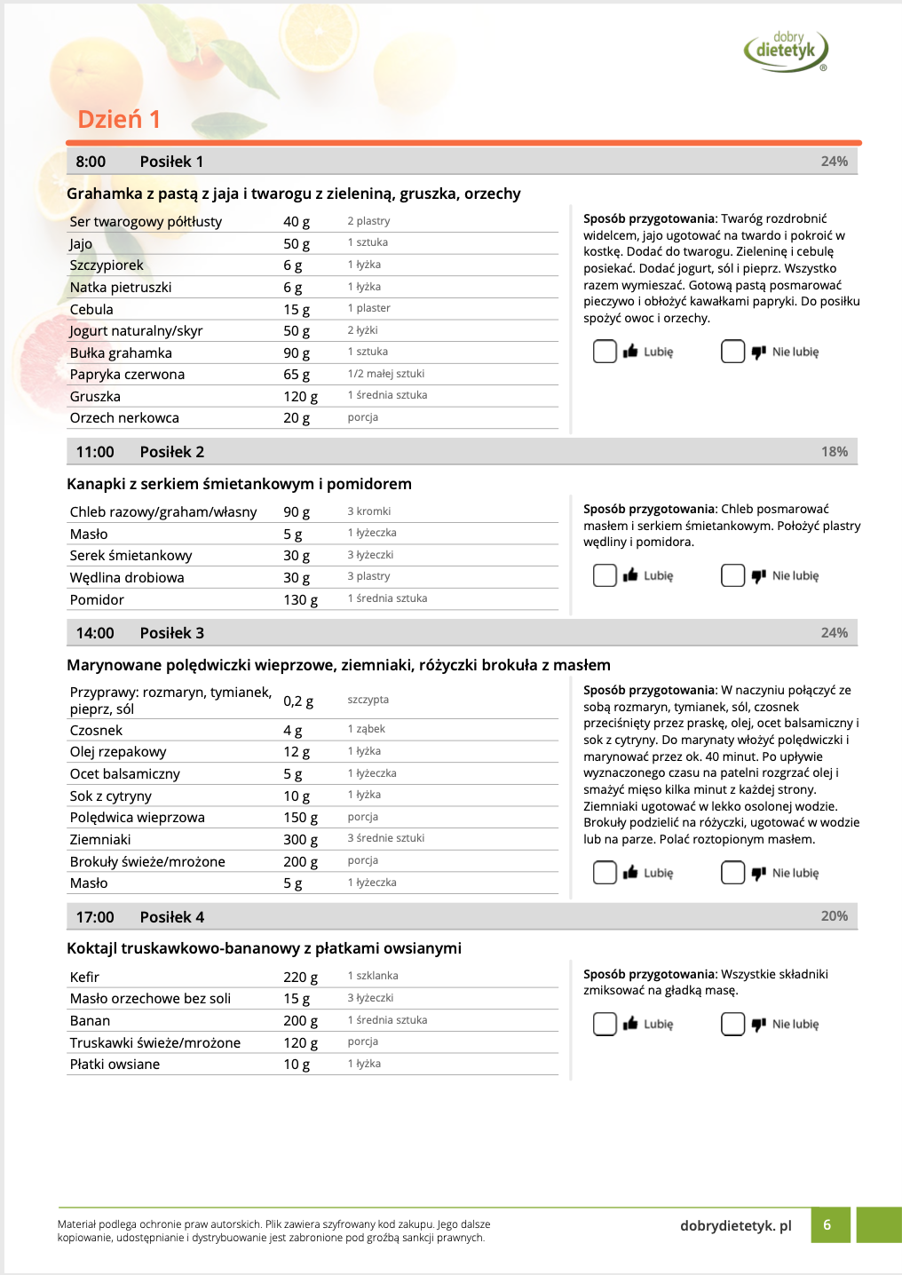 w formie propozycji posiłków (zamiast pojedynczych jadłospisów jednodniowych, przygotowano propozycje kilku propozycji dań na każdy posiłek). Tutaj nie uzależniamy Cię od tego jakie masz np. w danym dniu zjeść śniadanie czy obiad, tylko sam wybierasz sobie ulubione danie z kilku przedstawionych przez nas propozycji.