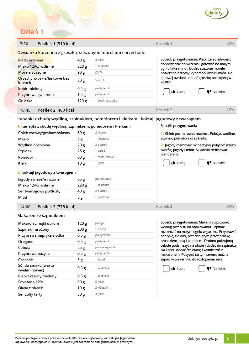 w formie precyzyjnych jadłospisów wielodniowych (na każdy dzień miesiąca jest opracowany osobny jadłospis). Tutaj nie musisz zastanawiać się co zjeść każdego dnia, gdyż będziesz mieć dokładnie wszystko rozplanowane.